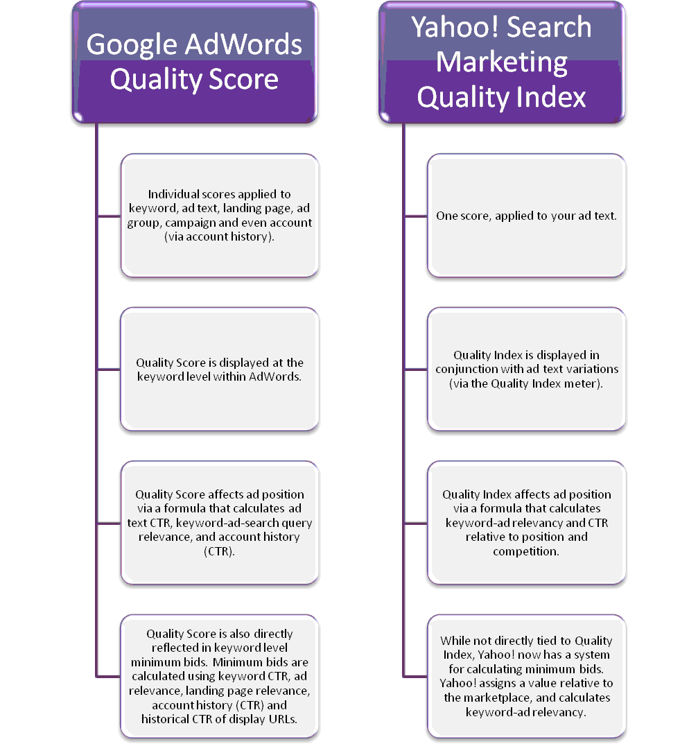 In Google, Quality Score is a part of the actual ranking formula. Quality Score X Maximum Bid = Ad Rank. The effect is more subtle in Yahoo!. Ultimately, if you maintain ads with a high Quality Index in Yahoo!, you will receive higher CTR and ad positions.