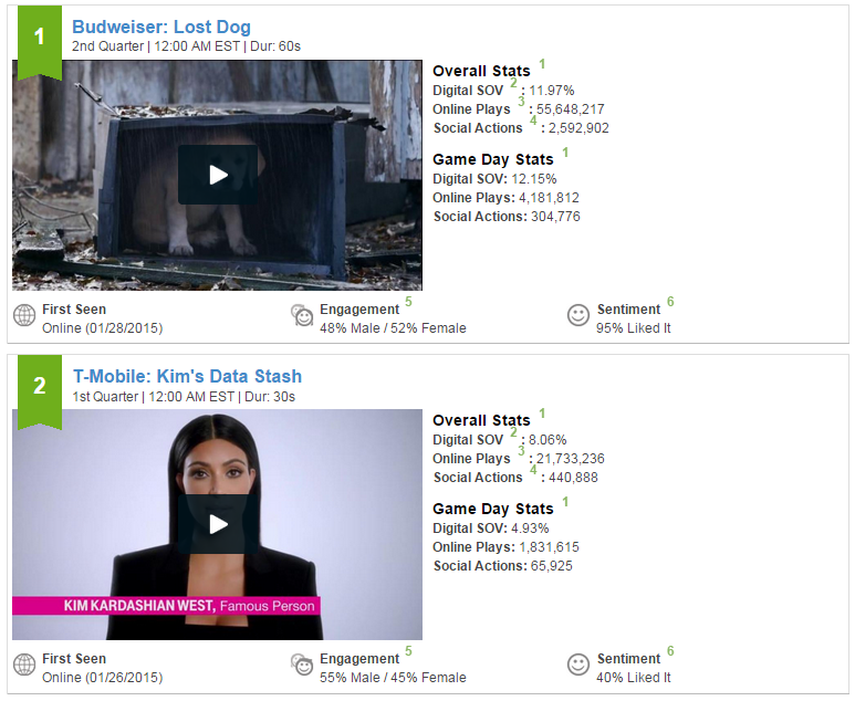 iSpot.tv indicates that Budweiser's Lost Dog commercial was the clear winner, while T-Mobile's Kim Kardashian-West commercial came in second. iSpot.tv even measures sentiment. Budweiser's commercial was liked by 95 percent of viewers, while Kim K got a 40 percent "like" rate - proving people are always on the fence about Mrs. West, but she still brings in the ratings. Even though it had the lowest sentiment of the top-20 commercials, T-Mobile's commercial with Kim K. was viewed more than 20 million times online.