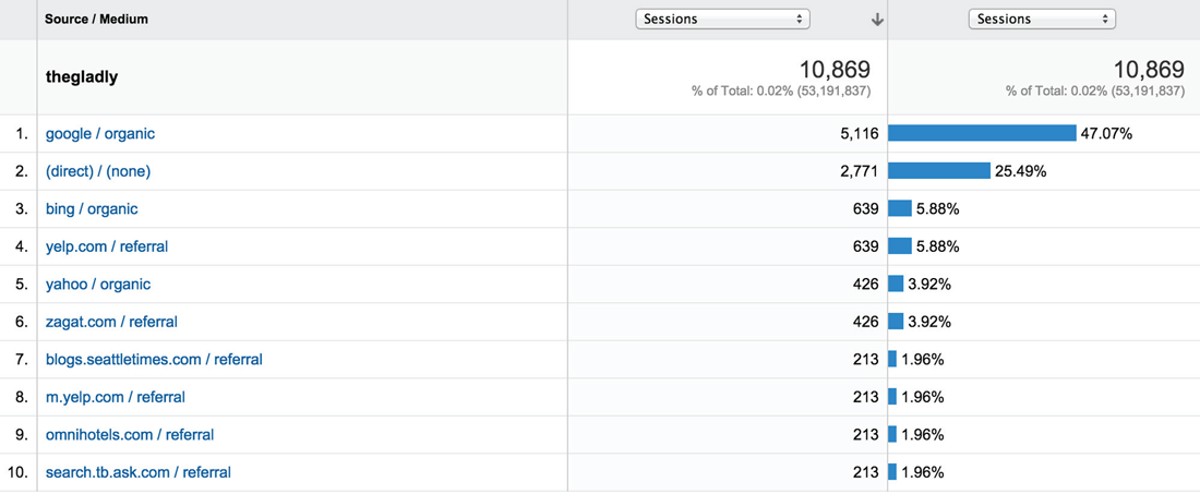 There is a great deal of actionable information a website can extract from the traffic sources reported in its analytics. For example, as illustrated in Image C, it appears that 47 percent of the website traffic is coming from Google search, which indicates the site's SEO initiatives are effective and working well. Going down the list, we can also see 6 percent of visitors are coming from Yelp. Traffic coming from the local business review site generally indicates a high level of visitor interest in a business and there are a few ways The Gladly can take advantage of this information. For example, the restaurant could attempt to get more traffic from Yelp by buying a premium package or perhaps can convince (or incentivize) more people to write positive reviews on the platform to raise even more awareness and thus get more visits. Analyzing traffic sources can help enterprises better understand which channels are the most successful and determine where they need a greater investment in outbound marketing efforts.
