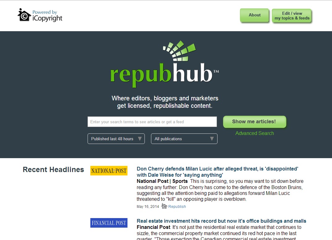 "repubHub is an innovative content network enabling anyone to reuse and republish content from world-class publishers. repubHub also provides publishers with a syndication platform that empowers them to safely and easily license content to others," said iCopyright CEO Andrew Elston.