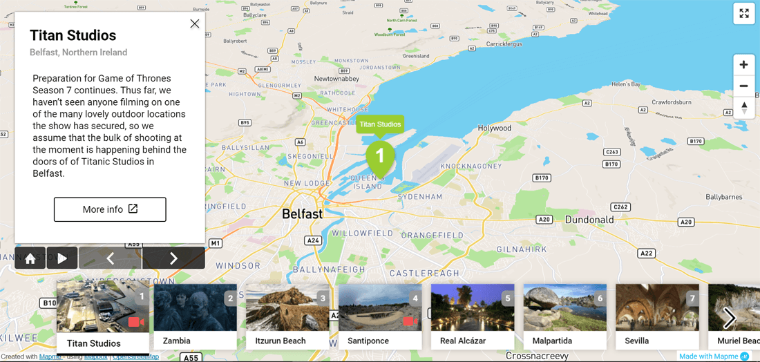 HBO or a fan site, for example, could use Mapme to provide an interactive map on their website showing where the wildly popular series Game of Thrones (GOT) is filming. The map isn't just a one-time click as visitors are able to click through each location for more information about the area and insights into GOT (increasing time spent on the site). A website could take engagement a step further and offer to provide real-time alerts when filming crews move or when more information is received (to get people back to the site).