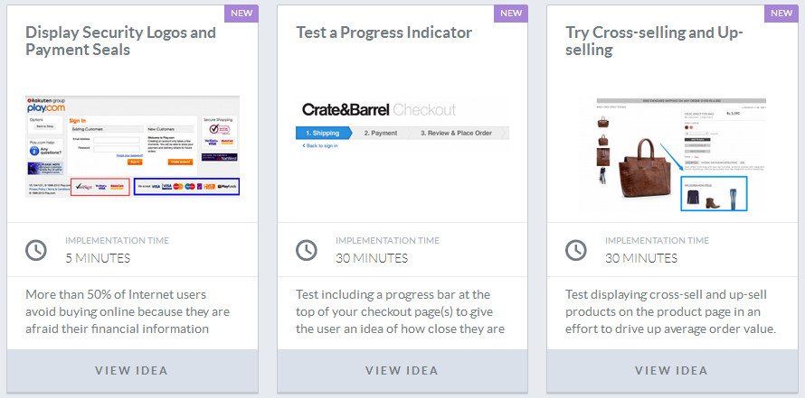 VWO's Idea Factory contains these ideas and already has more than 300 resources that will be expanded by industry. What's particularly useful about Idea Factory is that the different testing suggestions come with how long the tests would take to implement (e.g. 30 minutes).