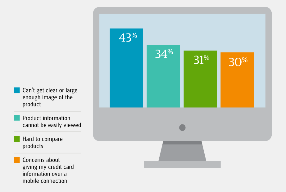 This is likely due to mobile's shortcomings, as 43 percent of respondents shop on their desktop computers rather than smartphones because they can't get clear or large enough images of the products. Comparatively, 34 percent of online consumers report not being able to easily view product information as a reason they shop on their desktops.
