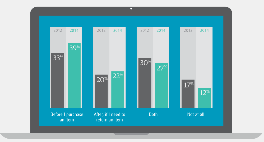 Since return policies influence conversion so much, 66 percent of respondents view a retailer's return policy before making a purchase. UPS also reports that the percentage of people who return items have gone up.