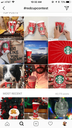 In 2016 Starbucks ran a UGC contest on Instagram inviting customers to post festive photos that incorporated that year's "red cup" design. Entries were tagged with the hashtag #RedCupContest.