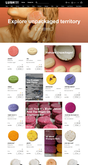 Lush's homepage, for instance, fails to represent the breadth of the company's available products (see image on the right). Instead, the homepage body is used solely to showcase haircare products; if the visitor is looking for skincare, makeup or anything else other than haircare, they will have to use the top navigation bar.