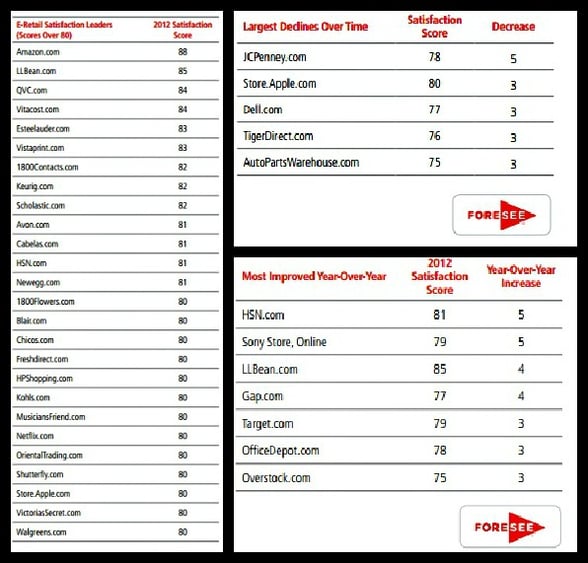 In fact, ForeSee's eighth annual Holiday E-Retail Satisfaction Index, which is based on more than 24,000 customer surveys collected from 100 top retailers during the 2012 holiday shopping season, reveals that Amazon remains the top online retailer for the eighth year in a row, with a customer satisfaction score of 88. Amazon's high score can partially be attributed to the retailer's variety of merchandise available on the site.