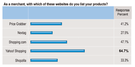 You can see that Yahoo! Shopping was the clear preference of merchants to list their products. Not coincidentally, it is also one of the most trafficked. And though traffic is an important factor for success with CSEs, there is value in using less popular sites. The PPC model often creates an auction style bidding system for ranking. So if I sell rocking chairs on Yahoo! Shopping, my products are going to be competing with dozens of other merchants selling the same thing. I must increase my bid to have my listing appear towards the top to get more clicks. However, if I use a less popular site I may receive fewer clicks, but I'll likely pay less for each click and arguably less per conversion. It's important to consider this factor when picking a CSE. In the end, the less popular site might result in a higher ROI.