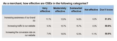 Finally, we asked if merchants are finding success when listing with CSEs. What we discovered was shocking. Just under half of all respondents found the sites to be somewhat effective in both driving traffic and converting sales. But in all categories, the winner was "Don't know" - at least half of all respondents have no idea if their CSE investments are paying off.