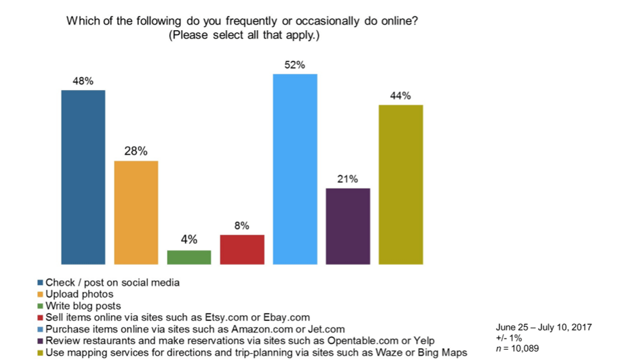+ From the selection criteria provided, the number one online activity is buying and selling, followed closely by check/post to social media and then using mapping services to round out the top three.