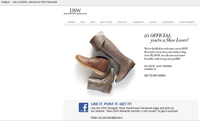 DSW not only personalizes the subject line and message by using my first name, but also adds social elements by offering an incentive for me to "like" the company on Facebook.