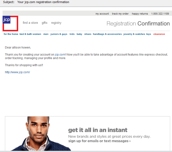 JCPenney's welcome message takes a similar approach to the aforementioned TOMS. It features a very simple layout, thanks consumers for registering with the company and outlines the benefits of having an account on jcp.com.