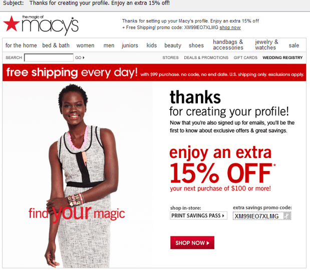 Macy's also didn't personalize their subject line or message, but the company does offer a 15 percent off promotion and free shipping.