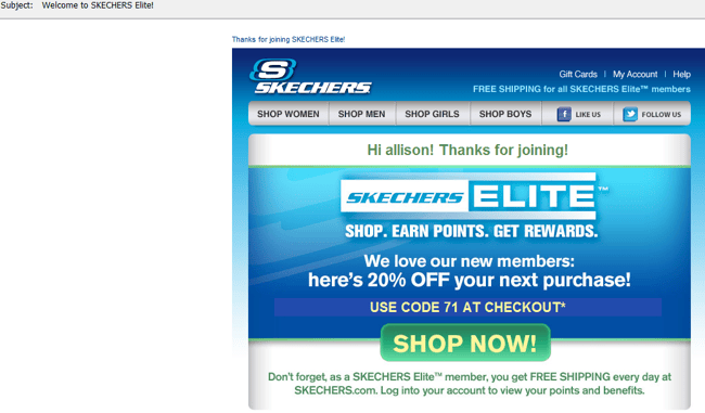 Skechers attracts attention from recipients by personalizing their message, offering a promotional code and featuring a large and bright call-to-action button.