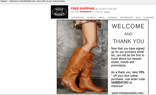 Steve Madden doesn't personalize their welcome message, however, the company does thank new subscribers and offers a 10 percent discount for the consumer's next online purchase. Furthermore, the company tells new subscribers what type of future messages they can expect from Steve Madden.