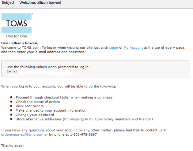 The design of Toms' email leaves a lot to be desired, however, the company does personalize both the subject line and message of their welcome email. Moreover, the company outlines the benefits of creating an online user account, as well as offers contact information for customer service needs.
