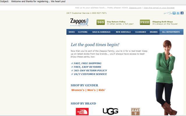 While Zappos didn't personalize this message, the company does welcome me as part of the "family" and highlights its outstanding return and shipping policy at the top of the message. Additionally, Zappos uses a smart strategy by asking recipients to add the company to their address book at the top of the message, because this will ensure that future messages aren't marked as spam.