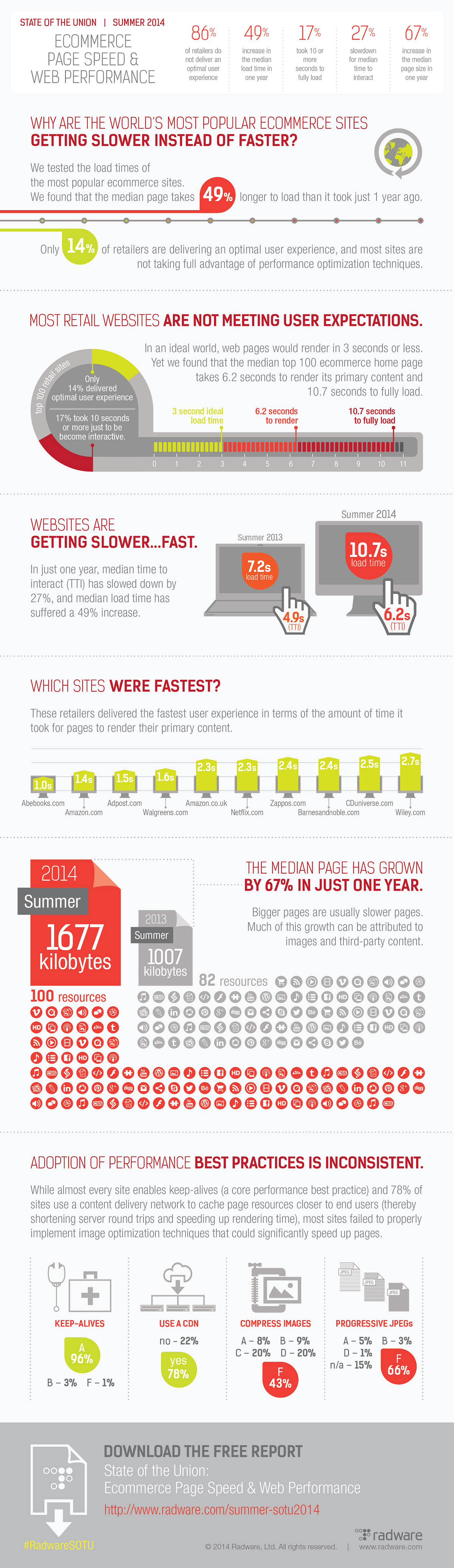 Radware's State of the Union: Ecommerce Page Speed & Web Performance, Summer 2014 study reveals that the median page of the top 100 retail websites has grown by 67 percent in just one year. That growth has led to many sites lacking when it comes to performance, with data showing that images are actually slowing sites down as most site owners are not taking advantage of image optimization techniques. In fact, the data shows that images make up 49 percent of the average top 100 pages' total weight.