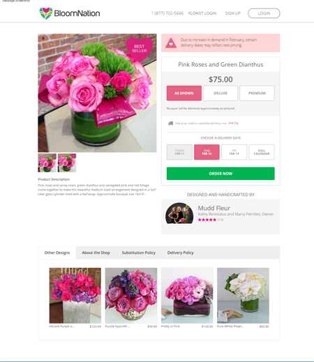 For the over 3,000 artisanal florists part of BloomNation, the company creates a variety of ecommerce tools for them to bring their physical business to the online world, including a free custom website, floral photo shoots of their actual images (see image below), PR opportunities, SEO optimization, a POS system for free and more. Florists also receive 90 percent of each sale, whereas on other flower sites, florists only end up with about 50 percent of the complete order after all is said and done, ultimately either breaking even or losing money on the sale.