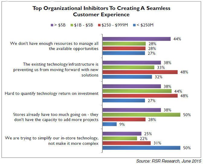 Even so, retailers have their own challenges of why providing a seamless experience seems out of reach - with "hard to quantify technology return on investment" having the most votes across organizational size.