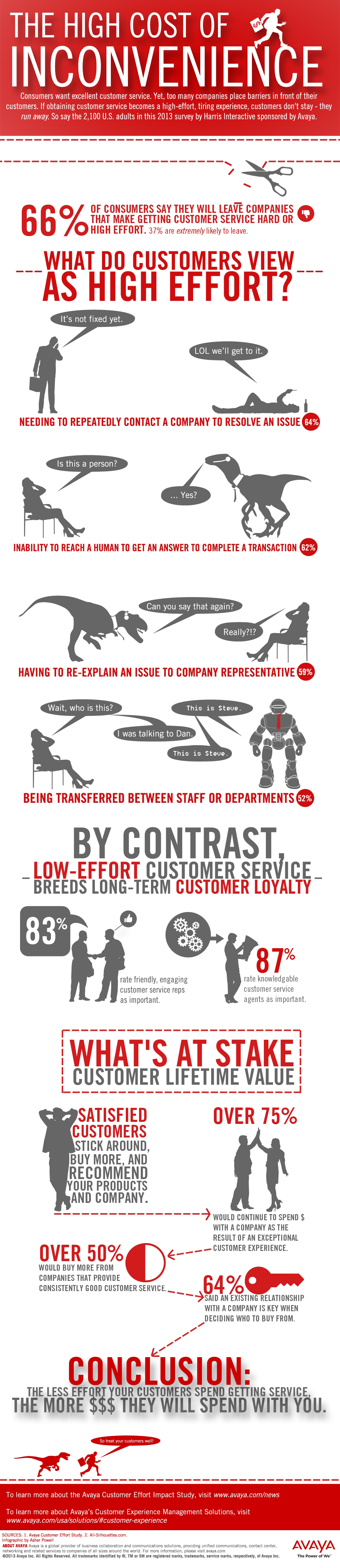 This means that inconvenience has its price. When online companies ask customers to jump too many hurdles to get the service they desire, the less likely they are to convert. For more customer experience survey results, see the Avaya infographic below.