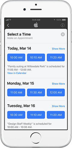 The scheduling component of Business Chat works with a person's iOS Calendar, which allows the end-user to see if they have conflicting appointments (see image).