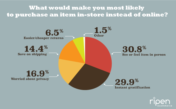 Because of this, Ripen ecommerce conducted a study to shed light on what makes American shoppers more likely to make purchases in-stores than online. The findings reveal that the majority of shoppers (30.8%), unsurprisingly, like to "see or feel" items in person before making a purchase. Additionally, 29.9 percent of shoppers cited instant gratification as a reason why they purchase in-store instead of online, followed by 16.9 percent of shoppers worried about privacy when shopping online and 14.4 percent of shoppers wanting to save on shipping by making purchases in-stores.
