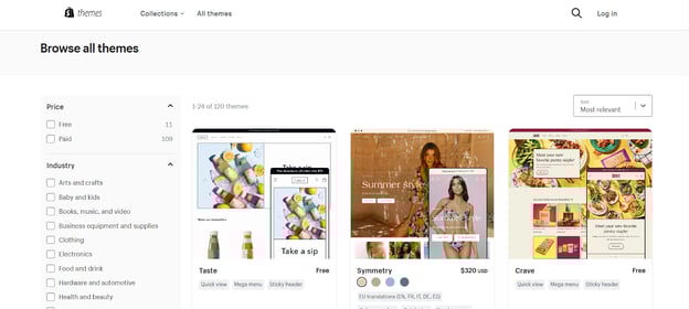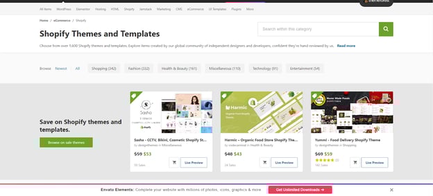 Shopify offers 11 free themes and 109 paid themes that cost from $180 to $350. You can also find over 1600+ Shopify themes and templates by third-party developers from Theme Forest: