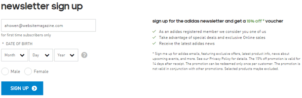 One way to collect birthday information is by asking subscribers when they sign up for an email list. Although some sign-up forms simply require consumers to enter their email address, marketers can create a short form that asks subscribers for additional information, such as their first and last name, birth date, gender and shopping preferences. What's more, marketers can offer incentives to new subscribers in exchange for this information. Adidas, for instance, asks new subscribers to enter their date of birth and gender when signing up for its newsletters. In order to motivate subscribers to fill out these questions the retailer offers incentives, including a 15% off voucher, as well as access to special deals, offers and news.