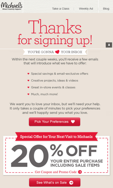 It is important to note that marketers who want to collect birthday information from current subscribers can take a similar approach to Michaels (shown above). Instead of sending a welcome email, however, marketers should simply send out an email telling their subscribers that they are "planning a birthday surprise," and then ask the subscriber to take a few minutes to add a birth date to their account.