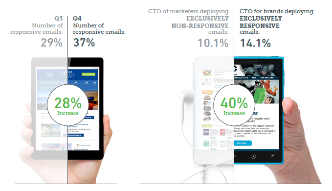 Not only are mobile users converting more through email, but they are also buying more with each order. Average order value (AOV) for mobile grew by 28 percent (Q4 2013 vs. Q4 2014), doubling the annual growth of desktop AOV. As mentioned, these revenue-producing metrics are likely a direct result in the increase of responsive emails sent (a 28 percent increase) and the increase in companies sending responsive emails exclusively (a 40 percent increase).
