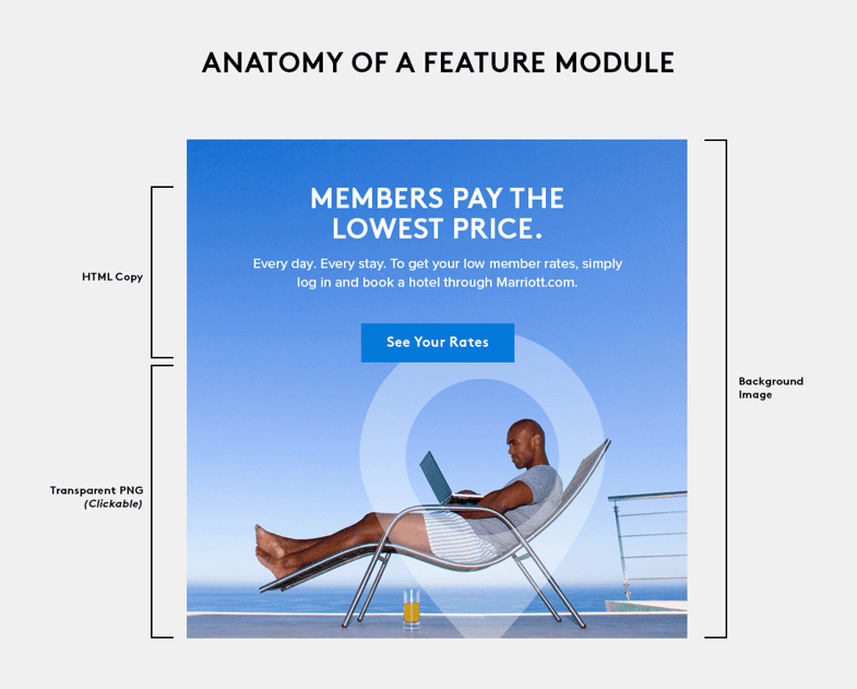 In practice, this had us placing headlines over large, experiential images - a look that is simple to execute in print, but tricky to execute in an email. This concept was what the style guide called for, which presented an issue we needed to solve. The solution we arrived at was using background images with clickable PNG overlays, as seen below.