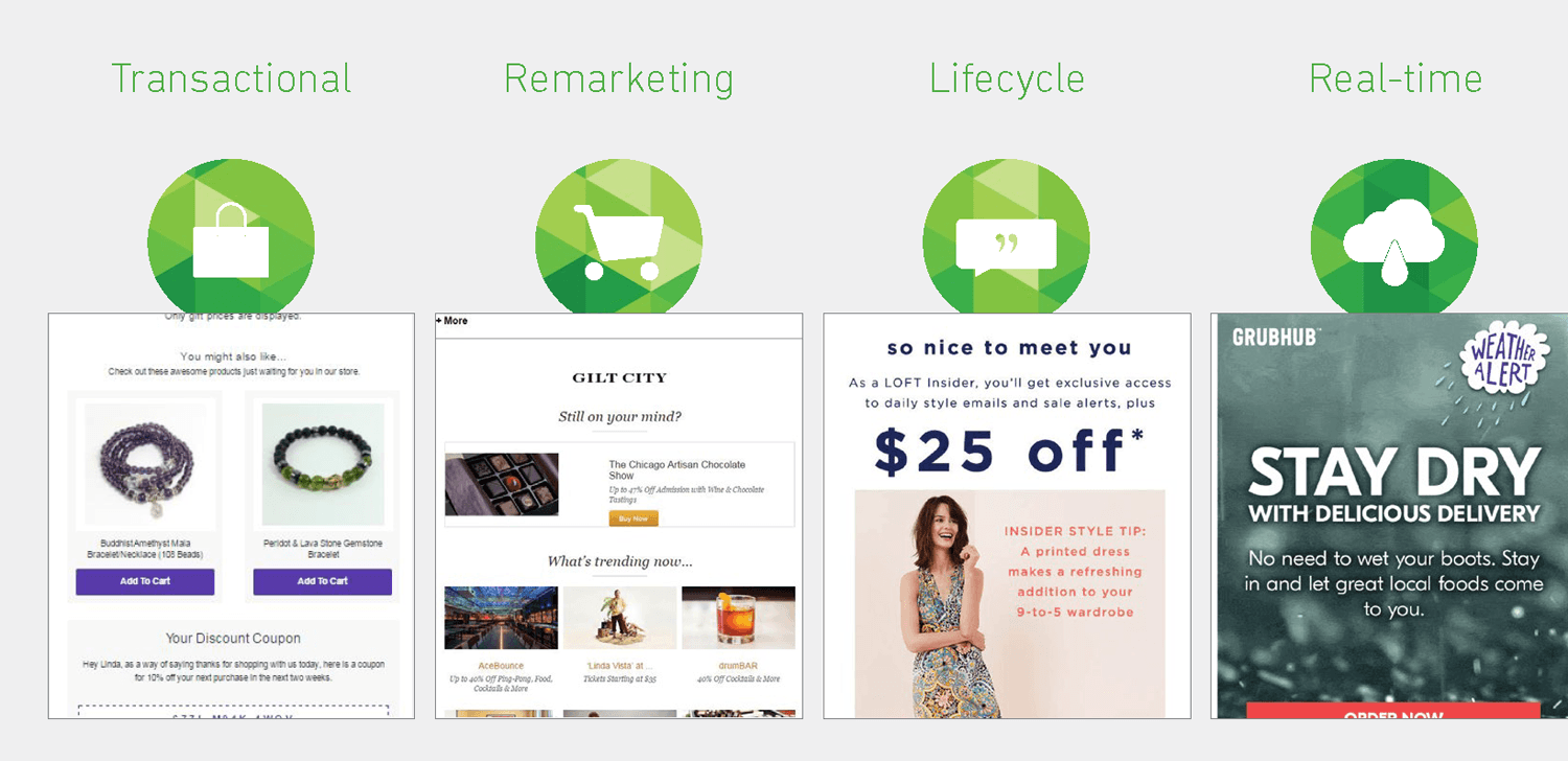 Examples of triggered emails include transactional (e.g., receipts, recommendations, shipping notifications), remarketing (e.g., shopping cart or browser abandonment), customer lifecycle (new sign-ups, anniversaries) and real-time (e.g., capitalizing on current events like an awards show or the recipient's local weather).
