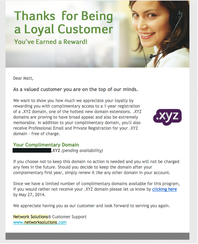 What has come to light is that Network Solutions gave away free .xyz domain names to developers who have a previously registered domain name with them. Network Solutions customers were sent an email stating their "complimentary" .xyz domain. The email stated that if they did not want their complimentary domain they had to click a link by May 27,2014.