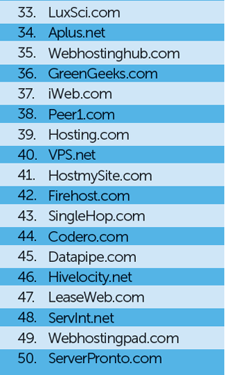 This Top 50 list (seen below) is, of course, a snapshot in time as the hosting industry moves along as fast as the rest of the 'Net. To keep abreast of all the news that matters in this space, be sure to bookmark (and visit often) our Web Hosting channel at