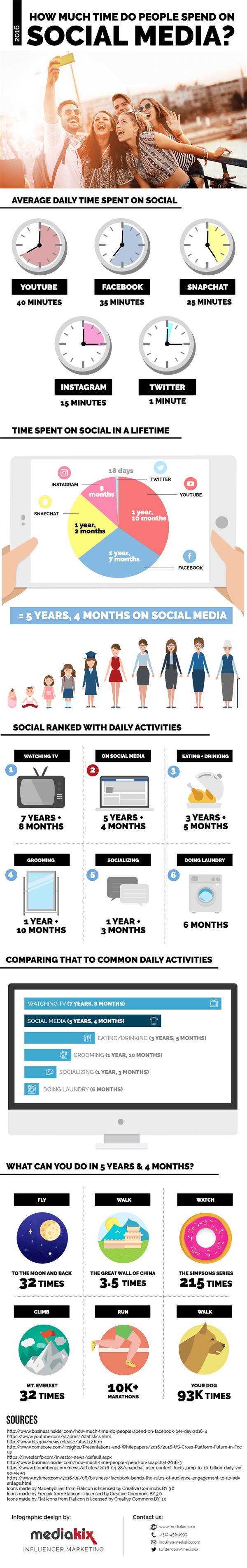 The following infographic provides a detailed overview of how much time people spend on social media, as well as insights into the demographics of social media users and the most popular content types.