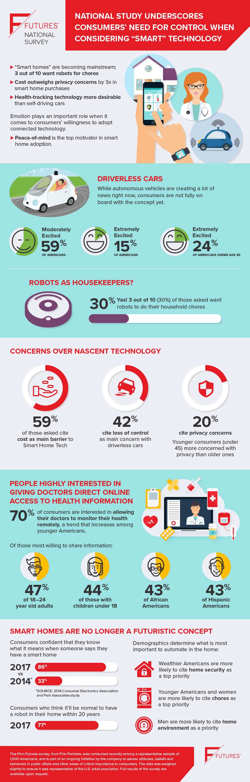 From automated thermostats to artificial assistants, the topic of "smart" technology has reached the masses with 86 percent of consumers "confident they know what it means when someone says they have a smart home" according to a Finn Futures survey conducted by Finn Partners. There are varying levels of excitement and concern for these technologies, however, particularly those used outside the home.