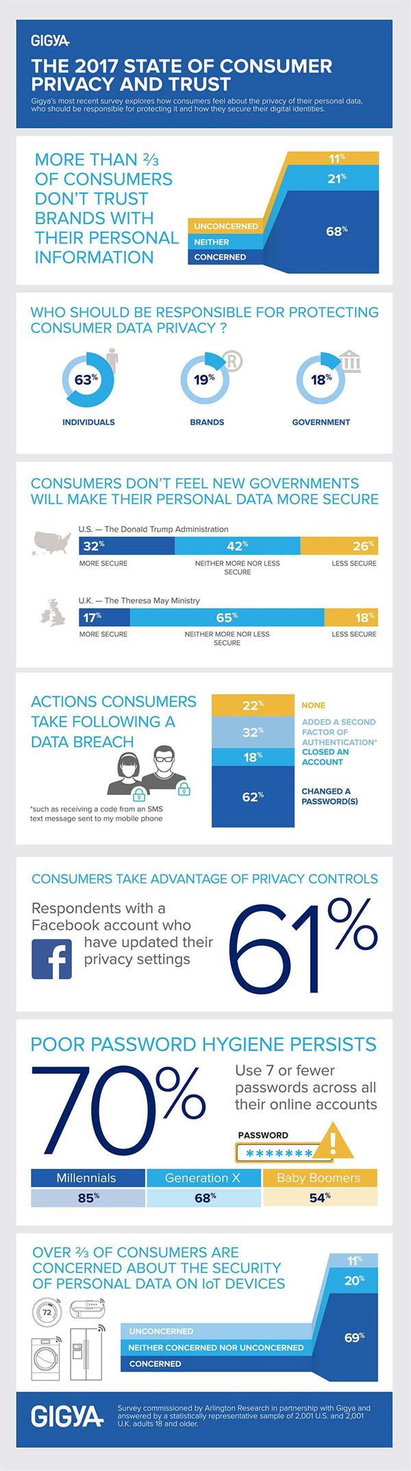 According to the "2017 State of Consumer Privacy and Trust" survey from customer identity management company  Gigya, 68 percent of consumers are concerned about how brands use their personal data. A similar number (69 percent) worries about security and privacy risks inherent in the increasing adoption of Internet of Things (IoT) devices, such as fitness trackers, smart watches and connected cars.