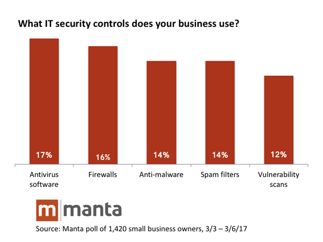 Of the small business owners who have IT security controls in place, according to Manta, the most frequently cited tactic was antivirus software, which is used by 17 percent of respondents.