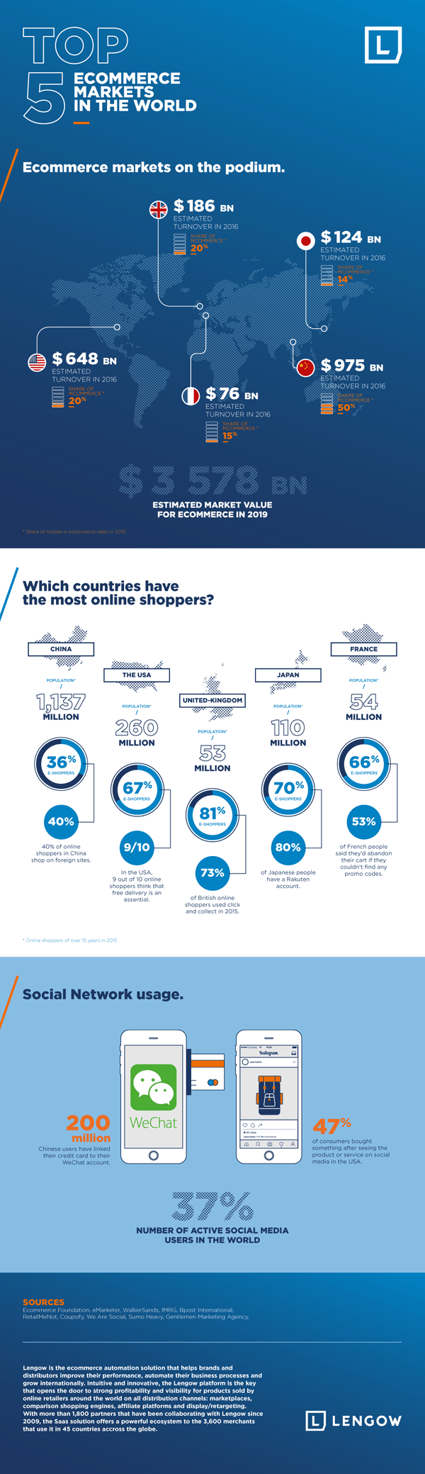 Let's look at the top five global ecommerce markets in the infographic (from Lengow) below, with some quick stats and figures about the top global players.