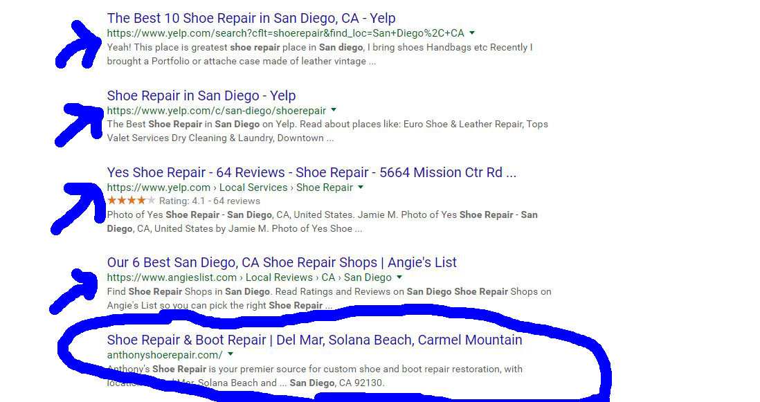 Local search results and directories, in fact, work hand in hand to increase a company's online visibility. For example, if you search for a merchant in your town on Google, chances are that a directory will be included immediately below the local search pack and much higher than an actual business listing. For instance, the "shoe repair san diego" query provides four directories before a merchant.