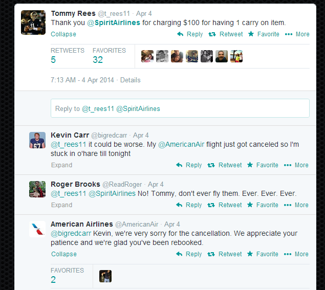 For an example, let's look to Twitter. When one user complained about Spirit Airlines for having to pay $100 for a carry-on bag, a fellow Twitter user responded, "It could be worse. My @AmericanAir flight just got canceled so I'm stuck in o'hare till tonight." Spirit Airlines never responded to the original tweet, but American Airlines took over the conversation, when it simply responded, "Kevin, we're sorry for the cancellation. We appreciate your patience and we're glad you've been rebooked."