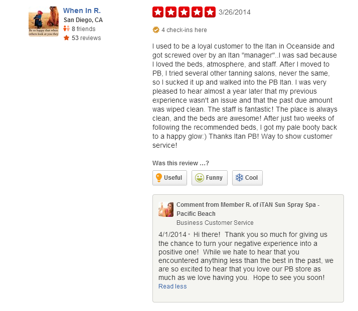 Although the reviewer left a five-star review of a tanning span in San Diego, the company still addressed the fact that the person once had a poor experience at another location. They could have been happy with the rating, but took the time to thank them for having the chance to improve their experience - pointing out the positives.