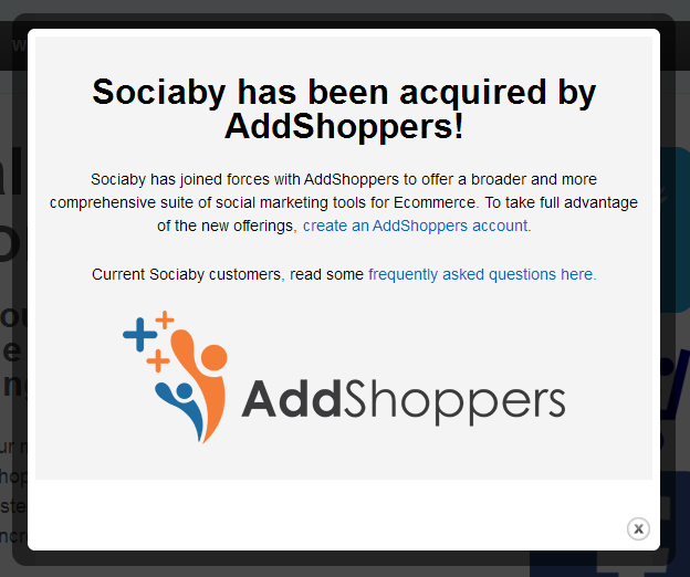 According to an announcement on Socaiby's website, the acquisition will enable AddShoppers to offer a more comprehensive suite of social marketing tools to ecommerce merchants. Sociaby customers will have until around September 1st, 2014 to transition the code on their sites to AddShoppers' new tools. It is also important to note that, for now, social media links that utilize the social.by short URL will continue to exist and redirect.