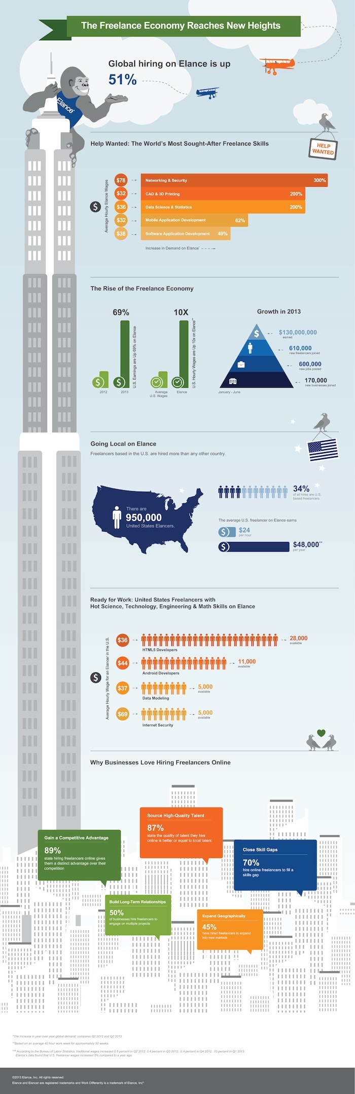 Along with the growth in the freelance market, Elance has grown globally too. For example, 170,000 new businesses of all sizes joined the platform in the first half of the year, and the total number of freelancers increased by more than half a million - reaching 2.8 million in total. Moreover, Elance has expanded its European operations by adding Country Managers and offices in the United Kingdom, Germany and in the Nordics (Sweden, Denmark and Norway).