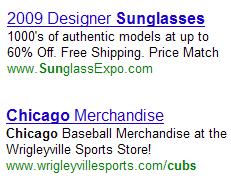 The second ad resulted from a search for "Chicago Cubs." Here, the user sees an option for Chicago Baseball Merchandise as well as the vendor. Now a search might be sparked with the vendor in mind, as it's a key component of the ad copy. The website URL further enhances the brand to the user.