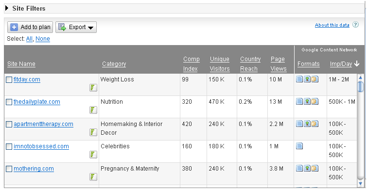 As an advertiser that utilizes the Google content network, the following image displays the top sites by number of impressions per day in various categories. one of the downside of my experience using Adplanner is that the only filter that can be applied is to restrict sites from appearing that do not appear on the Google content network or sites appearing on the content network that do not display a specific ad format or size. The ability to narrow down by category returned by AdPlanner would be helpful in this instance.