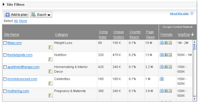 Once we define the audience we are looking for and their demographics and online behavior (and while we are doing so) AdPlanner displays sites within their content network and even outside of their content network which we might be interested in advertising upon. Websites can be sorted by site, category (determined by an automated system), "comp index" which shows the concentration of an audience relate to users in your define country, unique visitors, country reach, page views and whether or not they appear in Google's content network.