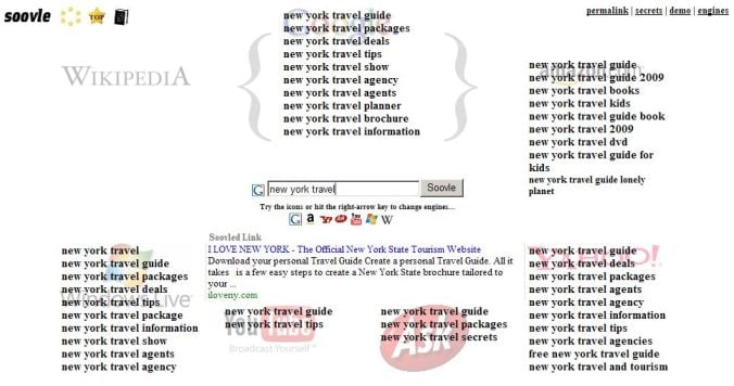 For example, a search for "new york travel" shows that you might want to include "new york travel guide," "new york travel packages," "agencies," "packages," and "secrets" in your copy (see image below.) You can also change the engines to search at the top right of the page. Some options include hulu, eBay, Buy.com and MSN Live, among others. Double click any result to see that engine's full list of results. You can also save searches by dragging results and terms to the little book on the top left of the screen.