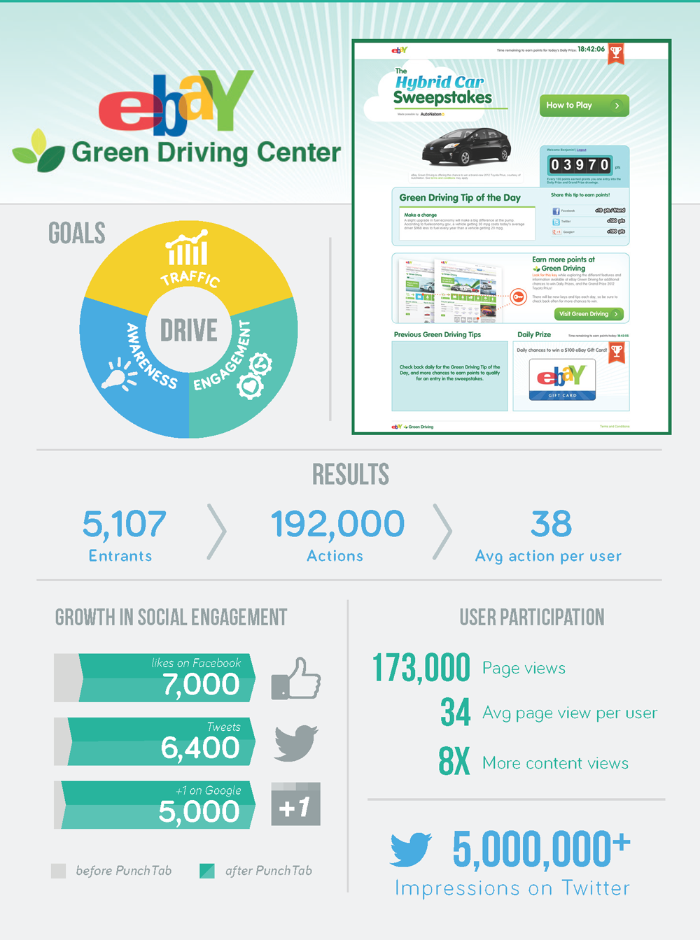 While only for a limited time, PunchTab helped eBay drive awareness and traffic to its Hybrid Car Sweepstakes by launching a simple, yet effective program that encouraged daily visits from a target audience who could uncover a new green driving tip that could be shared with friends, earning points toward the Grand Prize while entering to win the daily prize: a $100 eBay Gift Card. For even more interactivity, users could browse the site for embedded orange keys which signaled point earning opportunities when they viewed the tagged content.